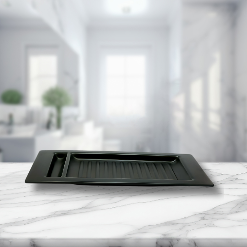 Serve your favourite grilled dishes in style with this Black Rectangular Grill Platter, designed to enhance both functionality and presentation. Featuring built-in grill ridges, this platter helps drain excess oil while keeping food warm. The integrated sauce holder allows for easy dipping, making it perfect for serving grilled meats, seafood, kebabs, and appetizers. Crafted with a sleek matte black finish, it adds a touch of elegance to any dining setup.